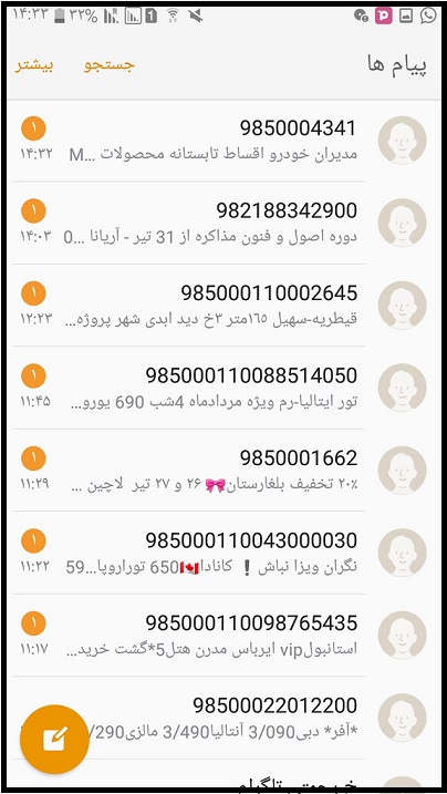 یکی از مشکلات روزمره همه ما پیامهای تبلیغاتی مشمئزکندده پیامکی بر روی تلفن های همراه است. این لیست پیامک های دیروز 22 تیرماه تلفن همراه بنده است.